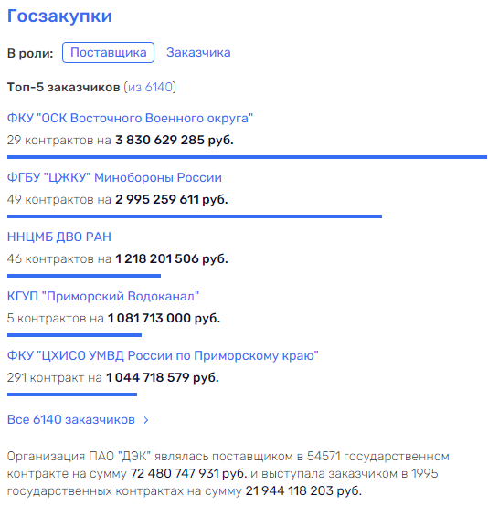 Однако все это может оказаться мелочами по сравнению с тем, какие крупные деньги проходят у ДЭК по госконтрактам. ПАО выступало поставщиком на 72 млрд рублей и заказчиком почти на 22 млрд рублей.