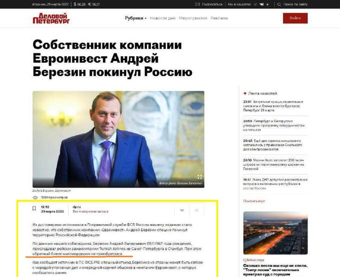 Причем эта информации «провисела» на сайте «Деловой Петербург», многолетним участником «Рейтинга миллиардеров» которого является Березин Андрей Валерьевич, всего несколько часов. И куда-то внезапно исчезла. Как и сам Андрей Валерьевич. Потому что никто не знает достоверно, где он находится сейчас.