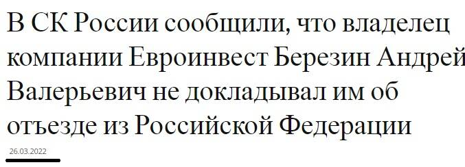 Неужели Андрей Березин почувствовал себя испуганным патриотом и убоялся Специальной Военной Операции? Взгрустнул о лазурных годах? Нет, это не про Березина. Его расчет достаточно точны, а опасения отнюдь не напрасны. Сейчас Березин Андрей Валерьевич в бегах и старается всеми силами спастись от уголовного преследования. РФ, потому за морями аферисту тоже не рады. Андрея Березина, которого называли королем госзаказов, сейчас разыскивает не только Следственный Комитет, но и ряд недоброжелателей, которых Евроинвест банально опрокинул.
