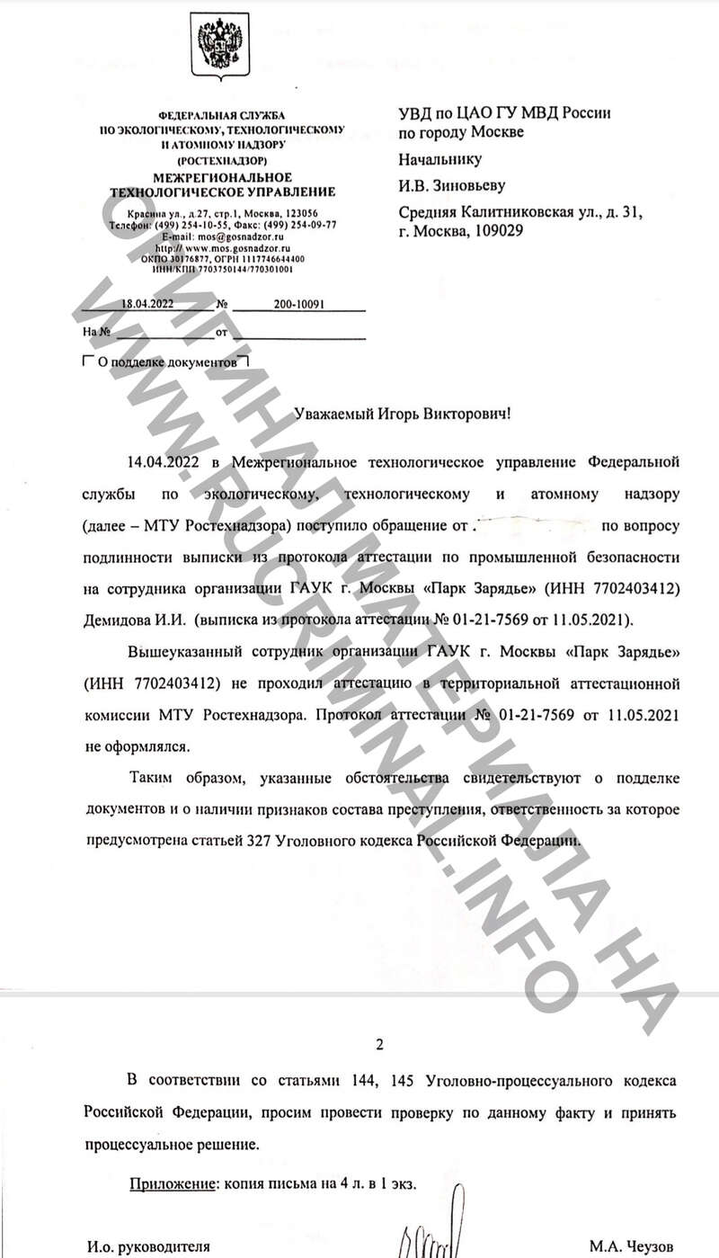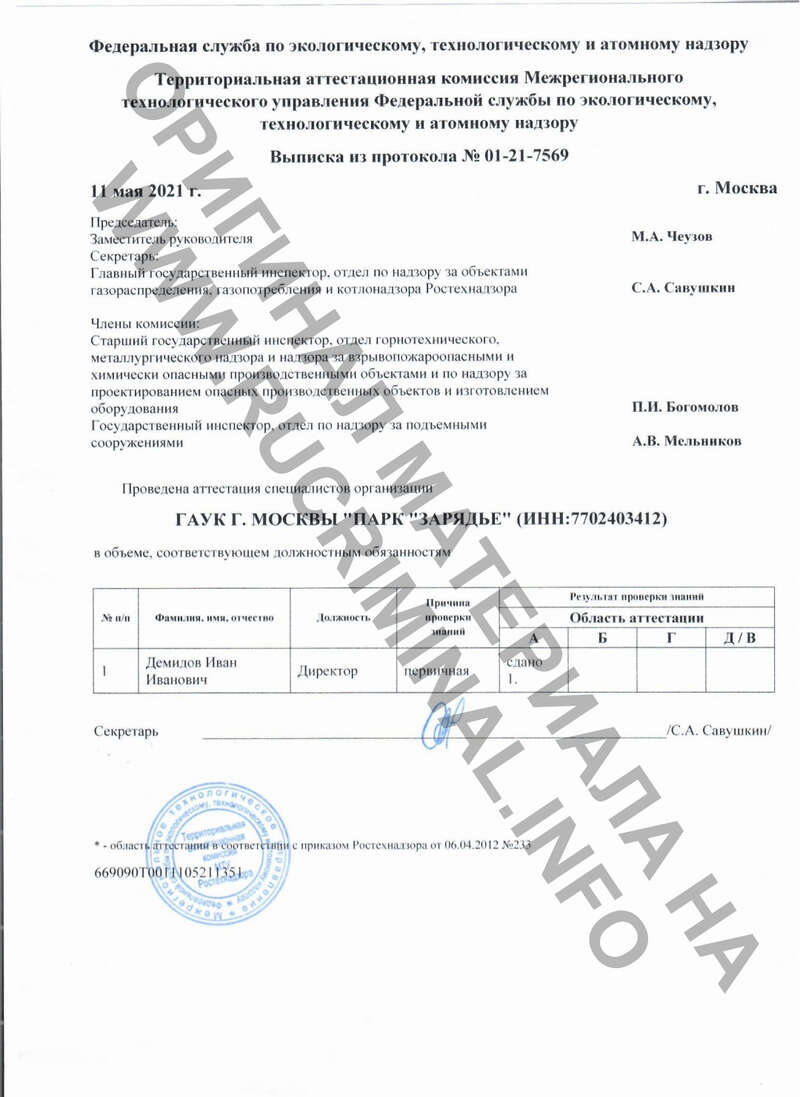 Итак, в парке Зарядье имеется поддельная выписка из протокола аттестации директора ГАУК г. Москвы "Парк "Зарядье" Ивана Демидова по промышленной безопасности, якобы пройденная им в комиссии Ростехнадзора.