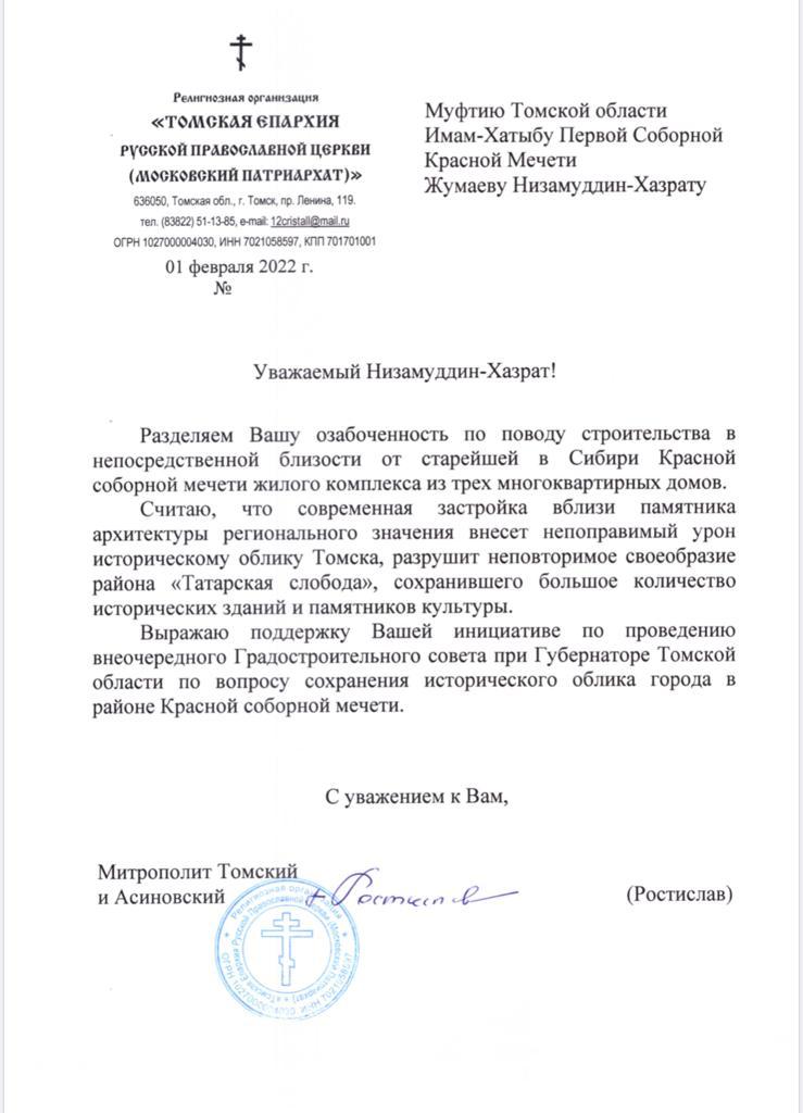 «Ответ мы получили. Кадыров написал, что это находится в ведении муфтия, и рекомендовал нам прислушаться к нему. Местная епархия РПЦ поддержала мусульманское духовенство и выступила за сохранение исторического облика Татарской слободы, где находится Красная мечеть. Мы в марте 2022 года обратились к губернатору с просьбой, чтобы он всё-таки провел градостроительный совет по данному факту, пригласив все заинтересованные стороны, а именно: мусульман, представителей их духовенства, общественность, ТОСы, застройщика и, разумеется, комитет по охране объектов культурного наследия. Ответ мы не получили, тогда губернатором был Сергей Жвачкин, но все эти вещи курировал Евгений Паршуто. Я предполагаю, что до него дошло это письмо, не могло не дойти… В мае, когда врио губернатора был назначен Владимир Мазур, мы по телефону записались к нему на приём, обозначив вопрос по историческому блоку с несколькими адресами. Нам сказали: «Ждите». Ждём до сих пор», – рассказала в интервью Бабру Бокова.