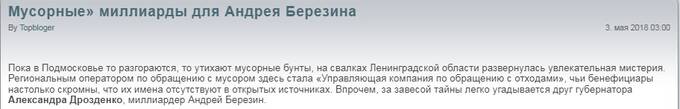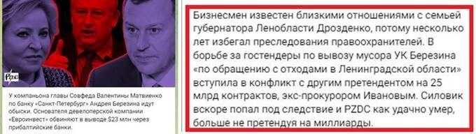 - Битвы за мусор всей Ленинградской области и куча выигранных тендеров благодаря дружбе с губернатором Дрозденко.