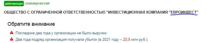 За последние несколько лет эта инвестиционная компания вообще не приносила выручки, там совсем не было продаж. За прошлый год отчетность вообще отсутствует в открытых источниках, а убытки этого общества с ограниченной ответственностью за позапрошлый год составили 20,8 миллионов рублей. Кроме того, данная организация числится в 8 судебных тяжбах на сумму в 3,3 миллиона рублей.