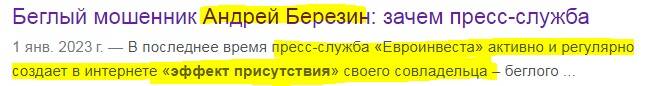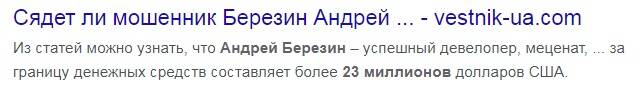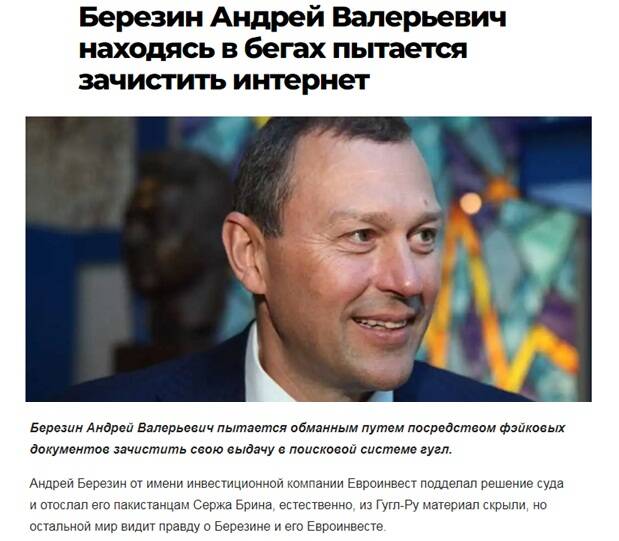 Также Березин от имени своей компании, используя фиктивное решение суда, сумел добиться удаления разгромных статей с Гугл-ру. Но вот, что для него печально, так это то, что в других странах эти материалы до сих пор доступны всем читателям.