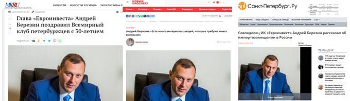 Так, медийники «Евроинвеста» в последнее время регулярно размещают на множестве различных сайтов свои релизы. Причем есть интересный нюанс. В каждой новости всегда упоминается сам Березин таким образом, чтобы читатели были уверены в следующем. Владелец этой инвестиционной компании постоянно находится на своем рабочем месте и лично принимает участие во всех проводимых мероприятиях. Только вот, как бы вы не пытались, вряд ли сможете найти в новостях свежие снимки Андрея Валерьевича, а также его нет и на общих фотографиях с мероприятий. Во всей новостной ленте используются старые снимки из архива.