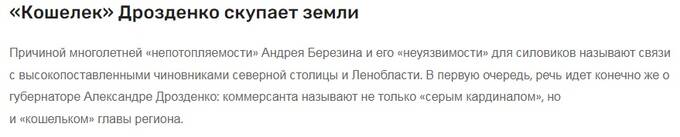 - Многочисленные земельные аферы при поддержке губернатора Ленинградской области А.Дрозденко. Березин массово скупал земли сельскохозяйственного направления и в обход моратория перепродавал их намного дороже только уже в качестве участков под застройку.