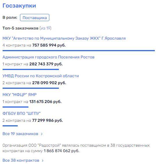 Основной вид деятельности "Радостроя" - вовсе не строительство, а, оказывается, оптовая торговля. При этом фирма оказалась более, чем крупным подрядчиком властей как Ярославля, так и Ростова Великого. Общая сумма госконтрактов оптовых торговцев" - свыше 1,8 млрд рублей, что не может не вызывать удивления. Из них 757 млн - от Департамента ЖКХ Ярославля, еще 282 млн - от администрации Ростова.