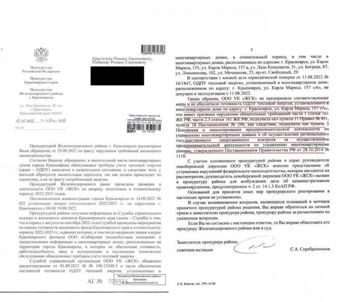 В другом документе говорится, что компания якобы и вовсе не справляется с содержанием находящегося у неё в управлении жилого фонда. В частности, проверка органов прокуратуры выявила нарушения со стороны ЖСК при подготовке к текущему отопительному периоду.