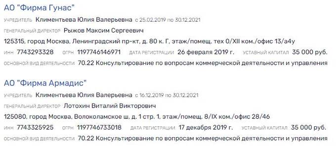 Интересна она не только этим. А еще и тем, что с 2019 по 2021 год была собственником 100% долей в АО "Фирма Гунас", а также в этот же период владела 100% АО "Фирма Армадис".