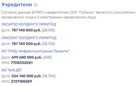 Сегодня вместе с ними в учредителях "Рубикона" оказались АО "РЖД-Инфраструктурные Проекты" и АО "ВЭБ.ДВ". При этом убытки "Рубикона" по итогам 2021 года составляют 86 млн рублей, а активы за год выросли с чуть более 100 млн до 2,6 млрд рублей.
