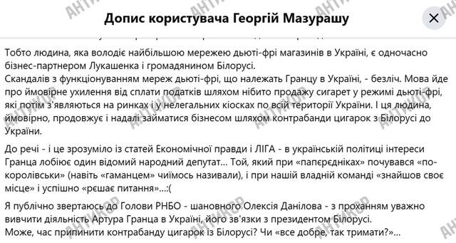 Из чего следует вывод, что он сумел наладить контакт с представителями нынешней украинской власти. И те не только закрыли уголовное дело по факту контрабанды, из-за которого Гранц убежал в Испанию, но и не отжали бизнес. Более того – позволили Артуру Гранцу заняться контрабандой сигарет в Евросоюз – бизнесом, который «крышуется» на самом высоком уровне, потому что приносит реальные миллионы долларов. Но и это еще не все – народный депутат от президентской партии «Слуга народа» Григорий Мазурашу писал в сентябре 2022 года (!), что Артур Гранц наладил контрабанду белорусских сигарет и является бизнес-партнером президента Белоруссии Александра Лукашенко.
