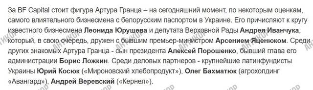 Реакции на это не было. Кроме того, на белорусское гражданство, которое тогда еще имел (и, возможно, имеет до сих пор) Артур Гранц, тоже закрыли глаза, хотя нардеп Мазурашу прямо обращался к секретарю СНБО по этому поводу. Но в санкционных списках, которые щедро раздает ОПУ, фамилии белорусско-армянского подданного Артура Гургеновича Гранца так и не оказалось. Ни за принадлежность к вражеской стране, ни за контрабанду, хотя и за то, и за другое в эти списки вносились иногда совершенно посторонние люди. На этом фоне обращает на себя внимание информация о связях Гранца – кроме уже упомянутого Иванчука, среди партнеров Артура Гранца были люди из ближайшего окружения пятого президента Украины.
