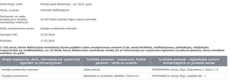 В 2015 году замначальника отдела полиции Виктор Ващенков оказывается уже в фирме "Gemmi.lv", которая до 2017 года принадлежала Дмитрию Челебию.