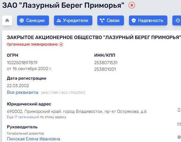 Еще 1/3 принадлежала женщине по имени Елена Пинская, (какая между ними родственная связь или это просто однофамилица, понять невозможно). Пинская, согласно базе Rusprofile, числится там как гендиректор. Она же занимала посты СЕО в фирмах "Вояж" и "Евро-азиатском туристическом агентстве" (обе компании к данному времени ликвидированы). Она же является совладельцем еще двух фирм с очекнь похожими названиями "Лазурный берег Приморья" и "Лазурный берег — недвижимость".