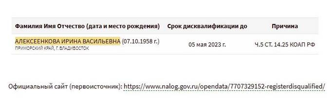 Примечательно, что с 6 мая 2022 года по 5 мая 2023 года Ирина Алексеенкова состоит в реестре дисквалифицированных лиц по причине нарушения ч.5 ст. 14.25 КОАП РФ. Эта статья предусматривает ответственность "за повторное непредставление или представление недостоверных сведений о юридическом лице или об индивидуальном предпринимателе, а также за представление документов, содержащих заведомо ложные сведения, если такое действие не содержит уголовно наказуемого деяния".