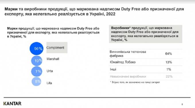 На продукцию с маркировкой Duty Free приходится 12,2% рынка. В свою очередь, 64% этой продукции изготовляется на Винниковской табачной фабрике, принадлежащей Григорию Козловскому. Наиболее распространенными марками этой группы нелегальной продукции является Compliment (с маркировкой для Duty Free) — 47%, а также Marshall, Marvel, Urta, Jin Ling, общая доля которых составляет 84%.