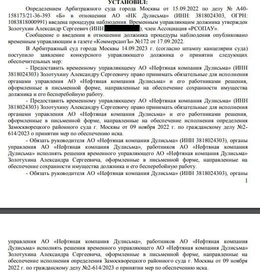 К слову, уже 14 сентября Золотухин в суде потребовал новых обеспечительных мер для "Дулисьмы", фактически пытался завязать на себя бесперебойную работу нефтекомпании. Всё бы ничего, но обеспечить бесперебойную работу компании и фирма даже работала, но платежи растворялись на счетах разных юрлиц.