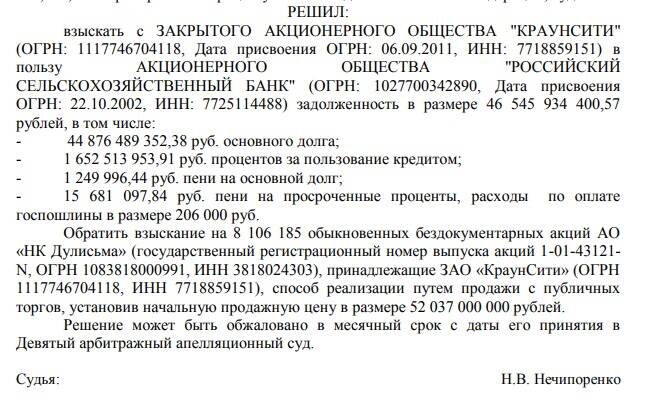 И вот, что занятно: некое ООО "Аквамарин", с которого также взыскали как с поручителя по долгам "Дулисьмы" 46,5 млрд рублей, заявляло, что "банк якобы стремится присвоить прибыльный бизнес АО "НК Дулисьма" и одновременно получить удовлетворение требований по кредитному договору от поручителей". Банк само собой подобные доводы отвергал. Параллельно с этим РСХБ изымает через суд акции ЗАО "Краунсити" у их владельцев - Александра Аронова и Игоря Дрогина, то есть пытается взять под контроль нефтеактив. Вероятно, для последующей перепродажи. Хотя интересанты уже, судя по всему, определились.
