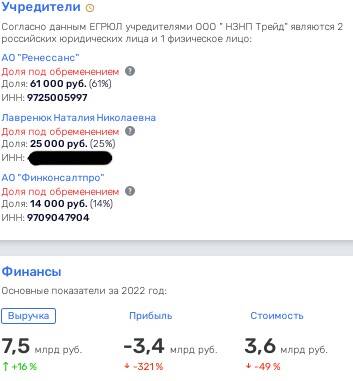 По данным "Руспрофайл", владельцами ООО "НЗНП Трейд" являются АО "Ренессанс" с долей 61%, Лавренюк Наталия Николаевна (25%) и АО "Финконсалтпро" (14%). При этом доли всех троих заложены именно в "Россельхозбанке".