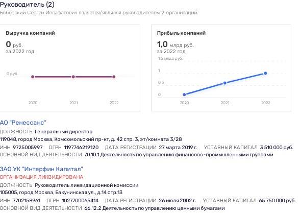 Компанией "Ренессанс" в свою очередь управляет Сергей Боберский, который ранее был руководителем ЗАО УК "Интерфин Капитал", что принадлежало лопнувшему позднее ОАО "Банк Российский Кредит". Издание "Банки.ру" называло актуальными бенефициарами экс-владельца Глобэкс-банка Анатолия Мотылева (26,70%), миллиардера Георгия Генса (20,01%, после смерти его активы унаследовал сын Филипп), Виктора Лукоянова (17,47%), Елену Вихореву (11,44%), Бориса Хаита (8,75%), Виктора Ускова (8,75%).