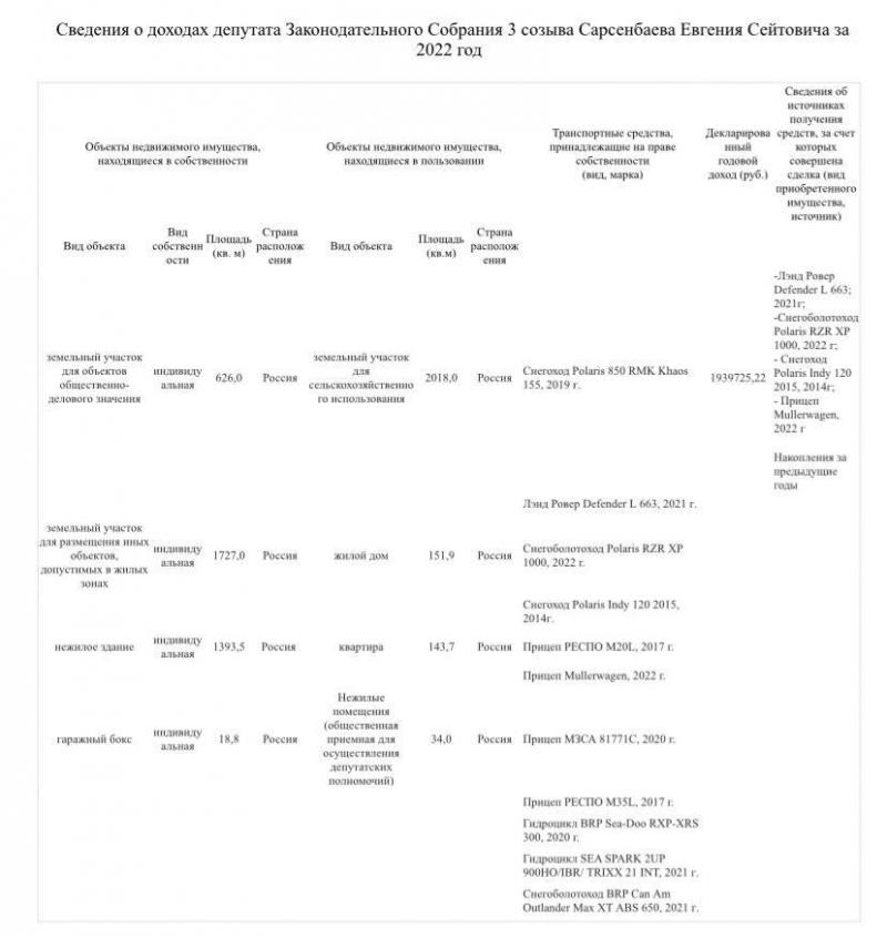 За 2022 год, на условиях самодеятельности, Сарсенбаев вообще показал доход в 1 939 725 рублей, хотя предыдущий отчетный – 2021 – год пролился на него золотым дождем на сумму 13 430 784. Почти в семь раз больше.