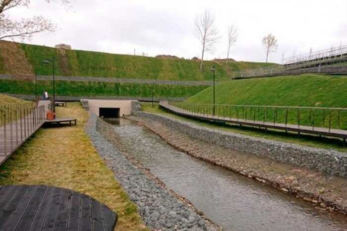UPD2: Как рассказали нам очевидцы, пострадавший — сотрудник парка, очищал ливнёвки, в какой-то момент его затянуло течением, стало уносить. Подбежали две женщины и схватили за руки. Прибывшие на место спасатели протянули ему трос, за который он смог схватиться и выбраться.