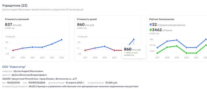 Как пишет "Утро News", совладелец АКБ "Ижкомбанк", генеральный директор ООО "КОМОС ГРУПП" Андрей Шутов и генеральный директор ООО "Региональный инвестиционный альянс" Андрей Осколков входят в список Forbes самых богатых чиновников и депутатов России, и, судя по всему, процветанию бизнеса во многом помогли связи с семьей ныне покойного президента Удмуртии Александра Волкова. Бизнес-партнером бессменных депутатов Госсовета Шутова и Осколкова является сын бывшего президента Удмуртии Андрей Волков. Бизнес-карьера Волкова-младшего началась с должности заместителя гендиректора ООО "Региональный Инвестиционной Альянс" (группа предприятий "Комос").