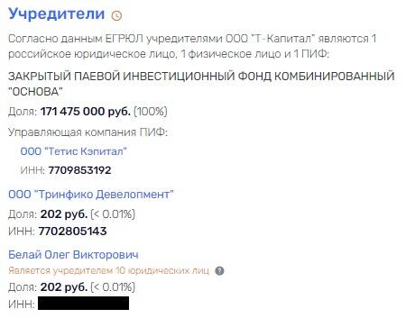Так вот, собственником ООО "Т-Капитал" является сам Олег Белай, его структура ООО "Тринфико Девелопмент" и закрытый инвестфонд "Основа", за которым, опять же, может скрываться кто угодно.