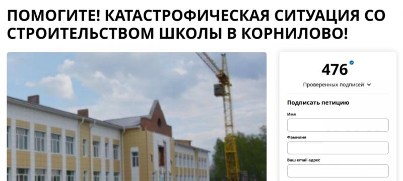 30 июня 2025 года некто Ольга Жогло опубликовала петицию «Помогите! Катастрофическая ситуация со строительством школы в Корнилово!», адресованную президенту РФ Владимиру Путину. На момент выхода этого материала её подписали 476 человек.