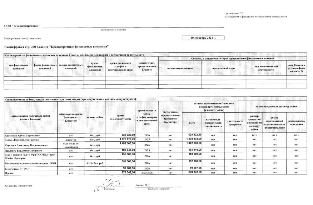 Самая значительная статья расходов — частные займы. За 2022–2023 годы компания выдала больше 4 млн рублей (больше $1,4 млн) своему бенефициару Армену Арутюняну, директору Дмитрию Гошко и связанным с ними структурам.