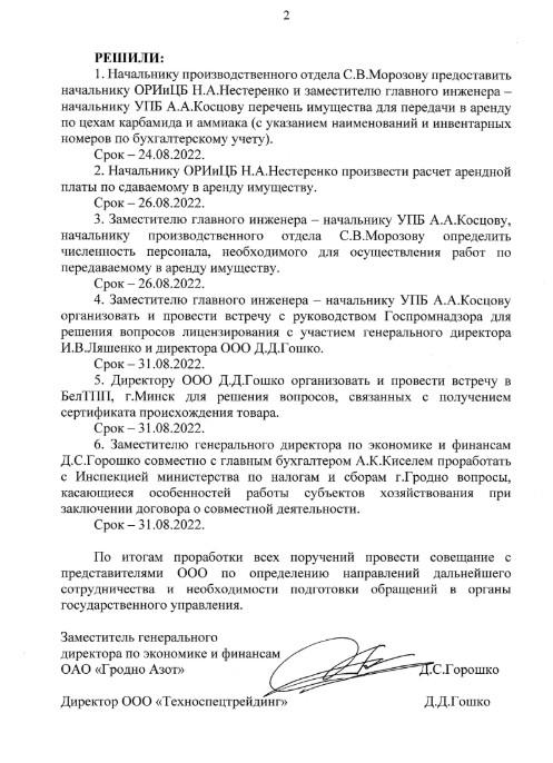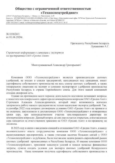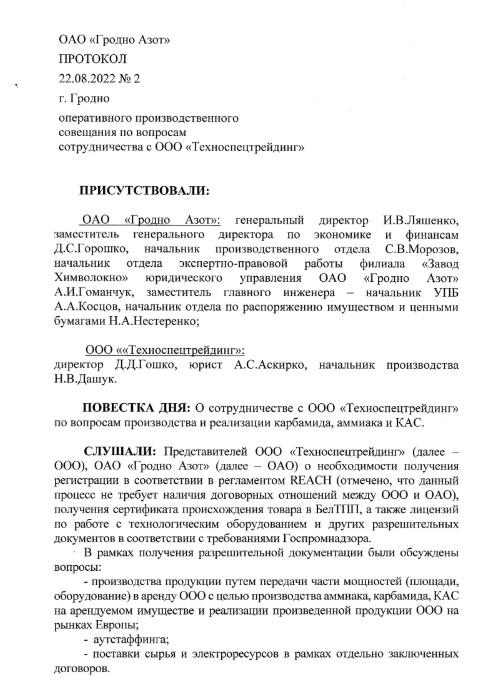 В конце лета 2022 года с предложением помощи в обходе санкций на «Гродно Азот» пришла первая частная фирма — ООО «Техноспецтрейдинг». В редакции есть протоколы заседаний руководства государственного завода с представителями компании.