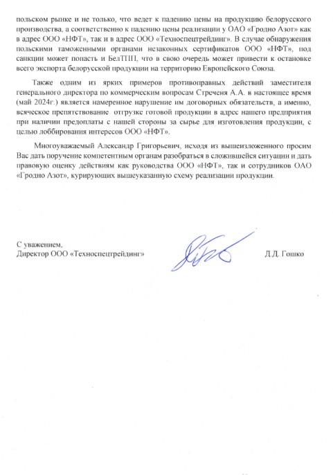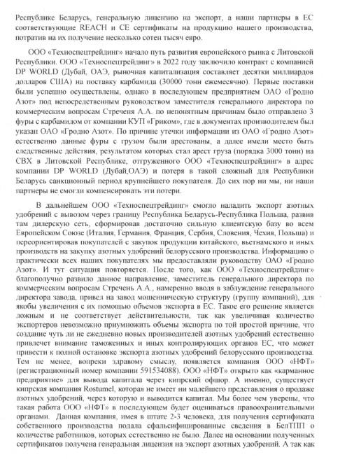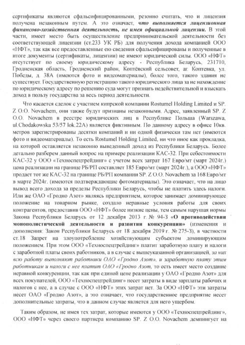 «...заместитель генерального директора по коммерческим вопросам ["Гродно Азота"] Стречень А.А., намеренно вводя заблуждение генерального директора завода, привел на завод мошенническую структуру (группу компаний), для якобы увеличения их помощью объемов экспорта ЕС. <...> ...существует кипрская компания Rostumel, которая не имеет ни малейшего представления продаже азотных удобрений... <...> Rostumel Holding Limited, ни что иное как прокладка, на которой оставляется незаконно выведенный доход из Республики Беларусь. <...> Это означает, что на лицо вывод всего дохода за пределы Республики Беларусь, чтобы не платить здесь налоги».