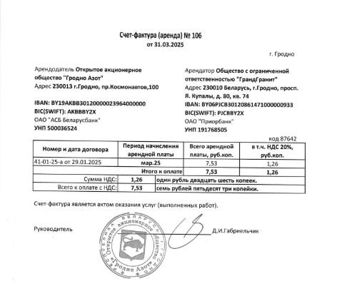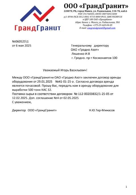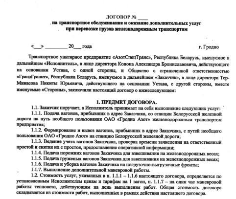 Первая — ООО «ГрандГранит» — подписала с «Гродно Азотом» и его дочерней компанией договоры на транспорт, поставки сырья и аренду оснащения для производства азотных удобрений.