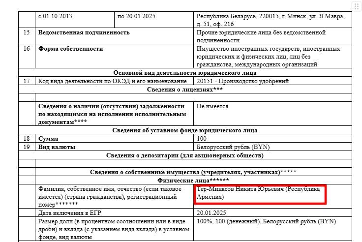 Тем не менее, компания получила сертификат собственного производства и на бумаге является самостоятельным производителем азотных удобрений. Владеет «ГрандГранитом» гражданин Армении Никита Тер-Минасов.