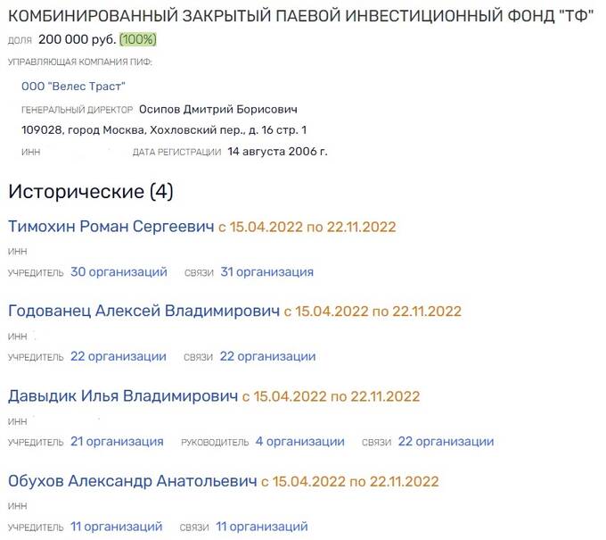 Возможно, что для этих целей Тимохин, совместно с ЗПИФ "ТФ", управляемым ООО "Велес Траст" учредили компанию "Л-Девелопмент". Дочерней же структурой "Велес-Траста" является "ИК Велес Капитал" - как сообщал "Росбалт" (признан иноагентом на территории РФ), через компанию работал скандальный украинский бизнесмен Константин Григоришин. Последний в ноябре 2020 года он был заочно приговорен в России к четырем годам колонии общего режима за неуплату налогов почти на 1,4 млрд рублей, писал "Коммерсант". И, кстати, именно ООО "Велес Траст" является управляющей компанией Комбинированного закрытого паевого фонда "ТФ", нынешнего учредителя ООО "МР Холдинг".