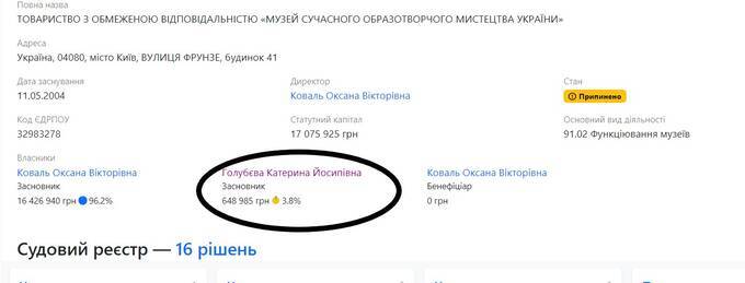 Еще одна схема вывода денег из банка – кредитование бизнесов под залог переоцененных картин. Картинами владел созданный Цюпко «Музей современного изобразительного искусства», который объявил о своем банкротстве. Кстати, обратите внимание на фамилию его соучредителя – Голубева Екатерина Иосифовна – и сравните с перечнем владельцев КЮЗ.