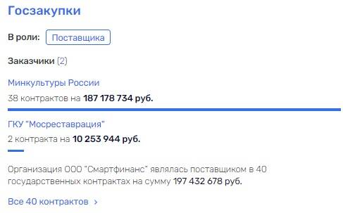 По итогам 2022 года у нее ни выручки, ни прибыли. В штате - один сотрудник при уставном капитале в 10 тыс. рублей. Зато у нее обнаружились госконтракты почти на 200 млн рублей. И 187 млн из них получены именно от Минкульта! К слову, и в те годы, когда она получала госконтракты, прибыль была мизерной 1-2 млн рублей. Куда девались деньги? Или финотчетность там просто рисовали?