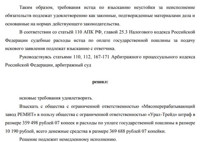 Однако уже другой суд, на схожую сумму, оказался для ООО "Ремит" менее удачным: в 2017 году Арбитражный суд Московской области рассмотрел иск ООО "Урал-Трейд" к ООО "Мясоперерабатывающий завод РЕМИТ" о взыскании суммы штрафа в 359 498 рублей 07 копеек. "Урал-Трейд" обвинял "РЕМИТ" в неисполнении обязанности по перечислению платежей за поставку товара в установленные договором сроки. Суд постановил полностью удовлетворить иск.