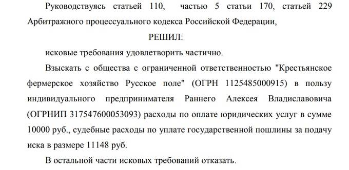 Имеются у данной структуры и суды – в том числе и в качестве ответчика, причем из трех судебных событий два как раз касаются того самого неисполнения или ненадлежащем исполнении обязательств по договорам поставки. В одном из исков суд отказал ответчику, а вот от второго совсем уж без потерь отбиться не удалось. Речь идет об иске ИП Алексея Раннего из Новосибирска к ООО "Крестьянское фермерское хозяйство Русское поле" о взыскании задолженности в размере 457405 руб., пени в размере 120167 руб. 26 коп и судебных издержек в размере 30000 руб.