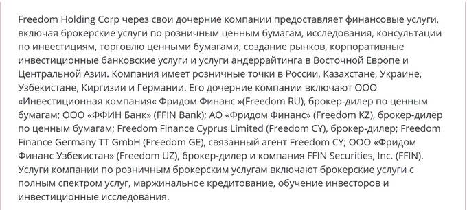 Впрочем, несмотря на такой либерализм, Америка – это все-таки Америка: в прошлом году в Соединенных Штатах Америки относительно Freedom Holding Corp. начато расследование Комиссии по ценным бумагам и биржам США (The United States Securities and Exchange Commission). Такие расследования длятся долго, но результаты обычно очень не радуют фигурантов.