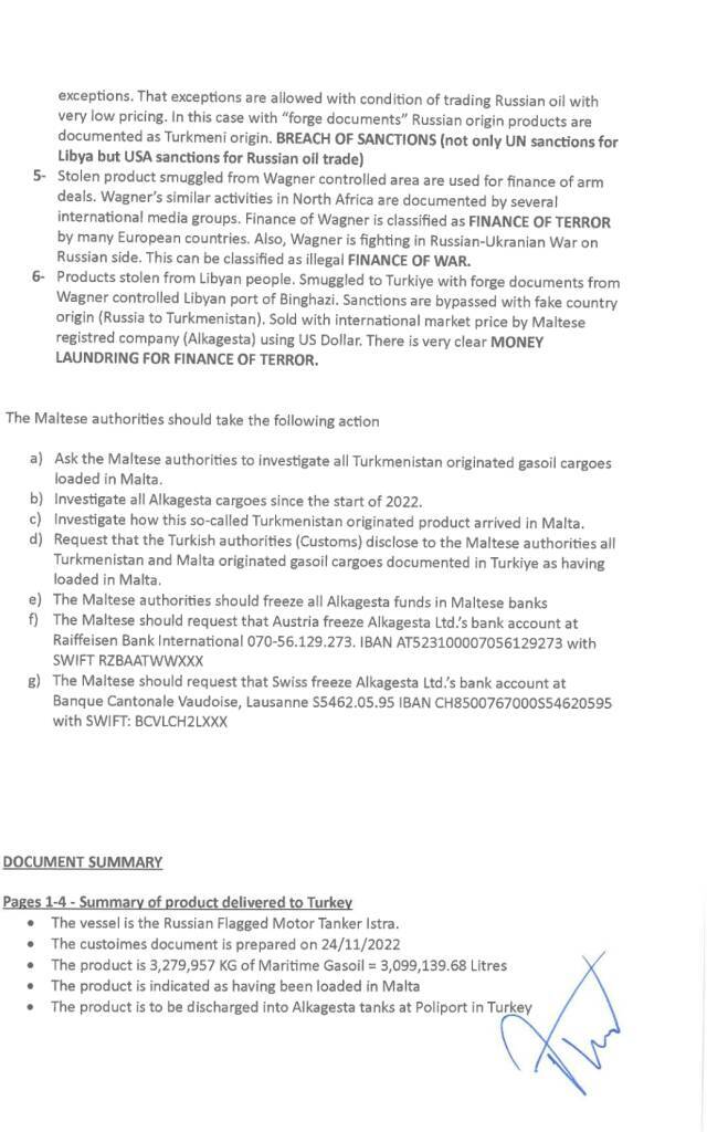 Alkagesta обвиняют в закупке ливийской нефти и последующей продаже с поддельными сертификатами происхождения. Компания также использует русскоязычных сотрудников в своих мальтийских офисах. Практика приобретения контрабандной ливийской нефти в мальтийских водах и районе Hurd’s Bank, а также ее перепродажа с поддельными документами уже была ранее зафиксирована в расследовании Совета Безопасности ООН.