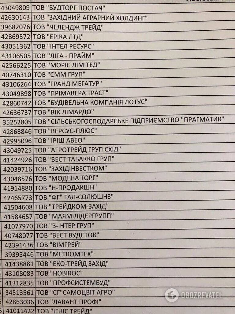 В распоряжении журналистов оказался список предприятий, из которых якобы состоит конвертационный центр Костюка. Львиная доля этих компаний уже попадала в скандалы. Именно этот список экс-министр финансов Игорь Уманский передал силовикам с заявлением о масштабном уклонении от уплаты налогов с помощью схем.