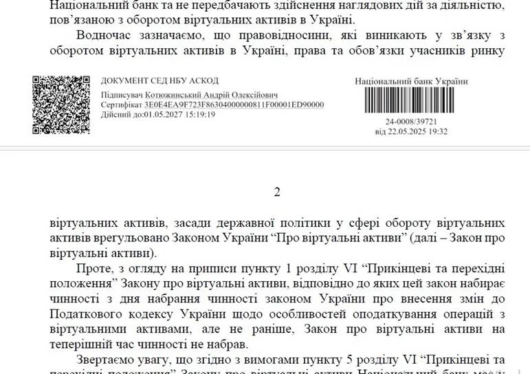 На сегодня получили ответ от Национального банка Украины, который сообщил, что: "Нормативно-правовые акты Национального банка на выполнение положений Закона о виртуальных активах, в частности, в части урегулирования прав и обязанностей участников рынка виртуальных активов, порядка их деятельности, осуществления операций с виртуальными активами, еще не приняты. Учитывая вышесказанное и учитывая, что вопрос регулирования оборота виртуальных активов на сегодня в действующем законодательстве Украины не урегулирован, у Национального банка нет правовых оснований для осуществления надзорных действий, в частности проведения проверок субъектов, осуществляющих связанную с оборотом виртуальных активов деятельность, и других мер реагирования относительно деятельности таких субъектов.