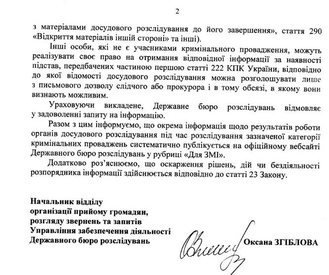 А вот ГБР в предоставлении какой-либо информации отказало, аргументируя это тем, что журналисты не являются участниками уголовного производства, поэтому доступа к материалам дела и получения информации не должны иметь.