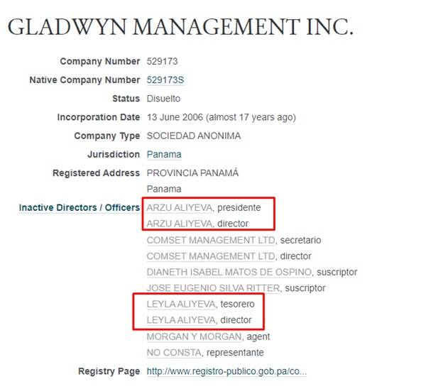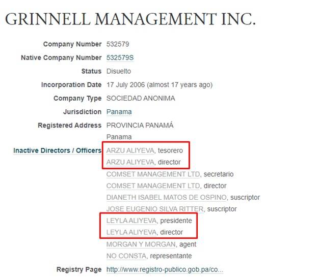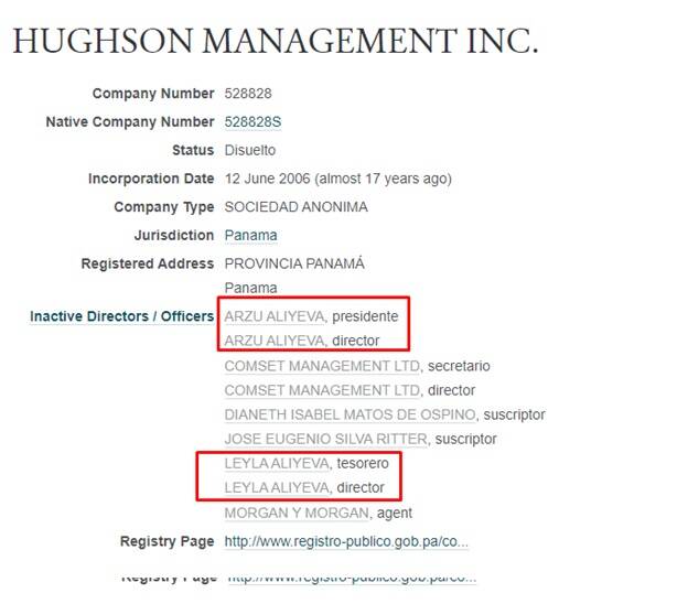 Младшая и старшая дочери главы Азербайджана Арзу и Лейла Алиевы были директорами Hughson Management Inc., Gladvyn Management Inc. и Grinnel Management Inc.