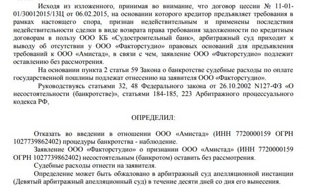 Согласно картотеке арбитражных дел, "Факторстудио" пыталась через банкротную процедуру взыскать с "Амистада" занятые у Судостроительного средства. Но суд отказал в иске из-за того, что договор цессии между банком и "Факторстудио" был признан недействительным. По итогу получается, что деньги в долг Горяинов взял, а возвращать их было якобы уже и некому?