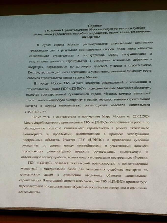 02.08.2024 года на собрании судей в Мосгорсуде, судьям через проектор была представлена эта компания и было сказано, что судебные экспертизы по делам застройщиков должны назначаться туда. (См. фото) После чего, судьи начали назначать судебные экспертизы в эту организацию, но она физически не справилась с объемами и начала возвращать дела обратно в суды без исполнения. В настоящее время организации активно нанимает судебных экспертов, судебные экспертизы назначаются Щербинский судом.