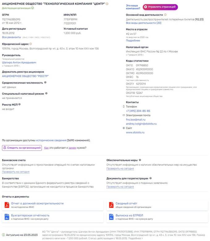 Любопытная деталь: после того, как Внешпромбанк обанкротился, оказалось, что одним из самых крупных должников был ТД "Столото", а сумма исков к нему на возмещение по просроченным кредитам и пр. - более 4 млрд. рублей.