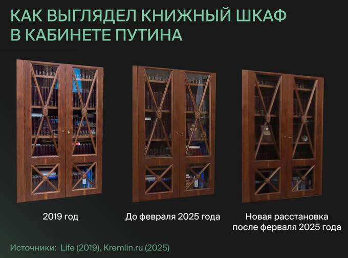 В кабинете Владимира Путина в Сенатском дворце Кремля между 17 и 24 февраля 2025 года произошли незаметные на первый взгляд изменения. На книжных полках за спиной президента, которые иногда попадают в объективы камер во время приемов, поменяли расстановку книг: появились новые издания (нижняя полка на первом фото), а Конституция РФ переместилась из правой части шкафа в левую.