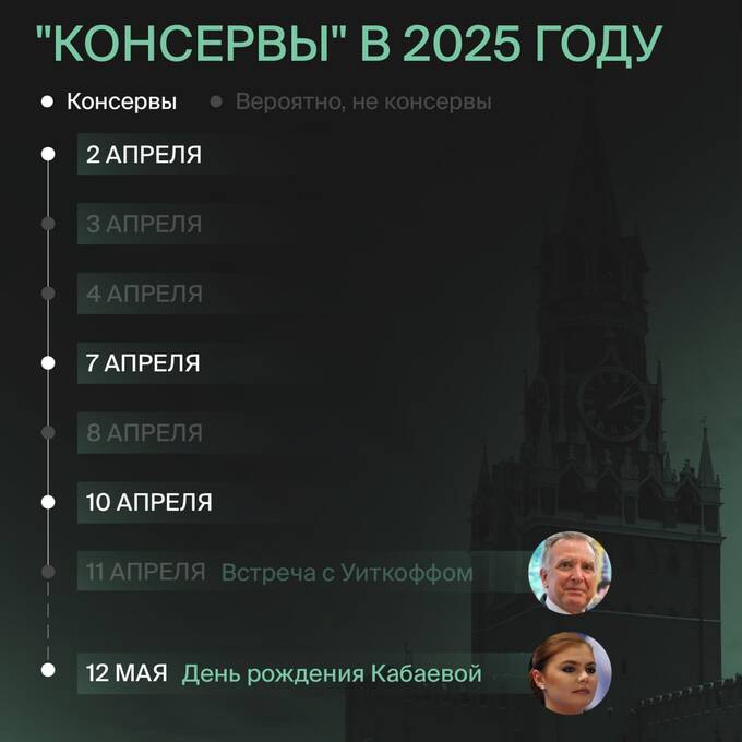 Если посмотреть на публичные мероприятия с участием Путина со 2 по 10 апреля 2025 года, бросается в глаза отсутствие групповых встреч и массовых мероприятий. На людях за пределами Кремля он появился только 11 апреля, когда в Санкт-Петербурге принял (http://kremlin.ru/events/president/news/76675) спецпредставителя президента США Стива Уиткоффа. Подготовкой этой встречи занимался спецпредставитель Путина Кирилл Дмитриев, который в начале месяца летал в США.